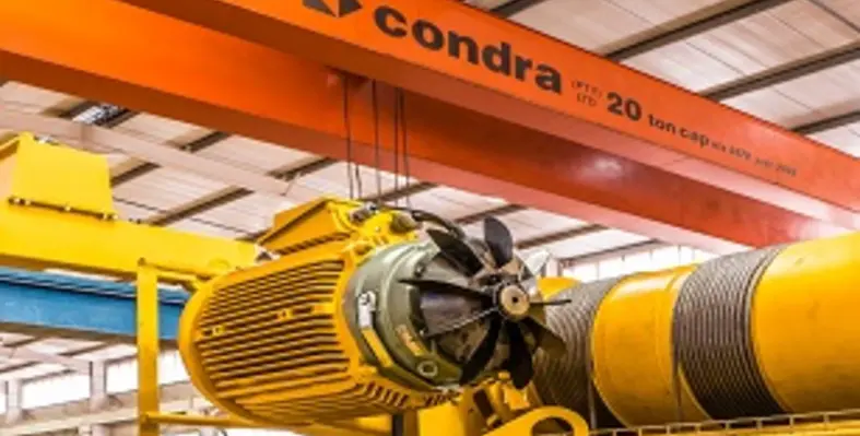 Inside Condra’s Johannesburg factory: an overhead crane positions an electric motor during assembly of hoist and crab. (Image source: Condra)